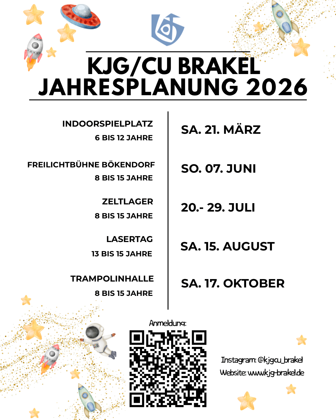 hier seht ihr einmal die Daten aller Monatsaktion 2026 von uns. Ihr könnt euch ĂŒber den QR-Code oder den nachfolgenden Link zu den Aktionen anmelden. Das gilt fĂŒr alle Aktionen, mit Ausnahme des Zeltlagers. DafĂŒr steht aber auch schon alles in den Startlöchern und die Anmeldung startet innerhalb der nĂ€chsten Wochen ebenfalls.