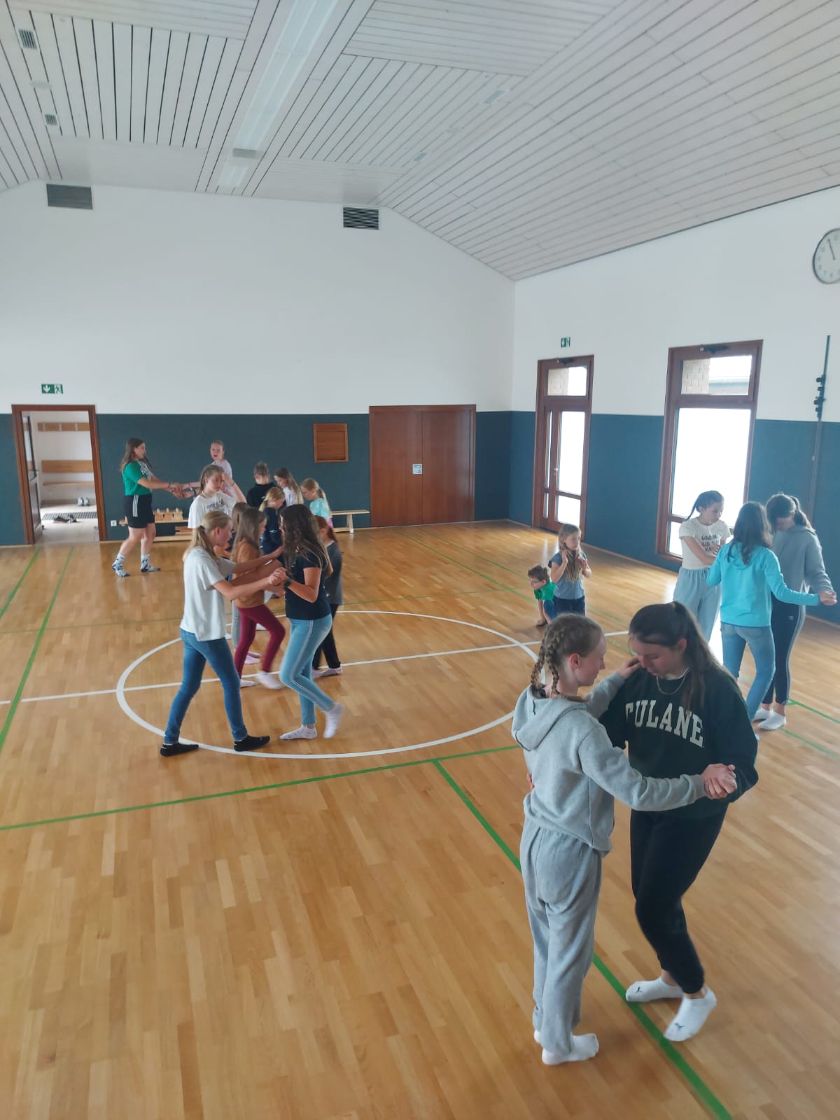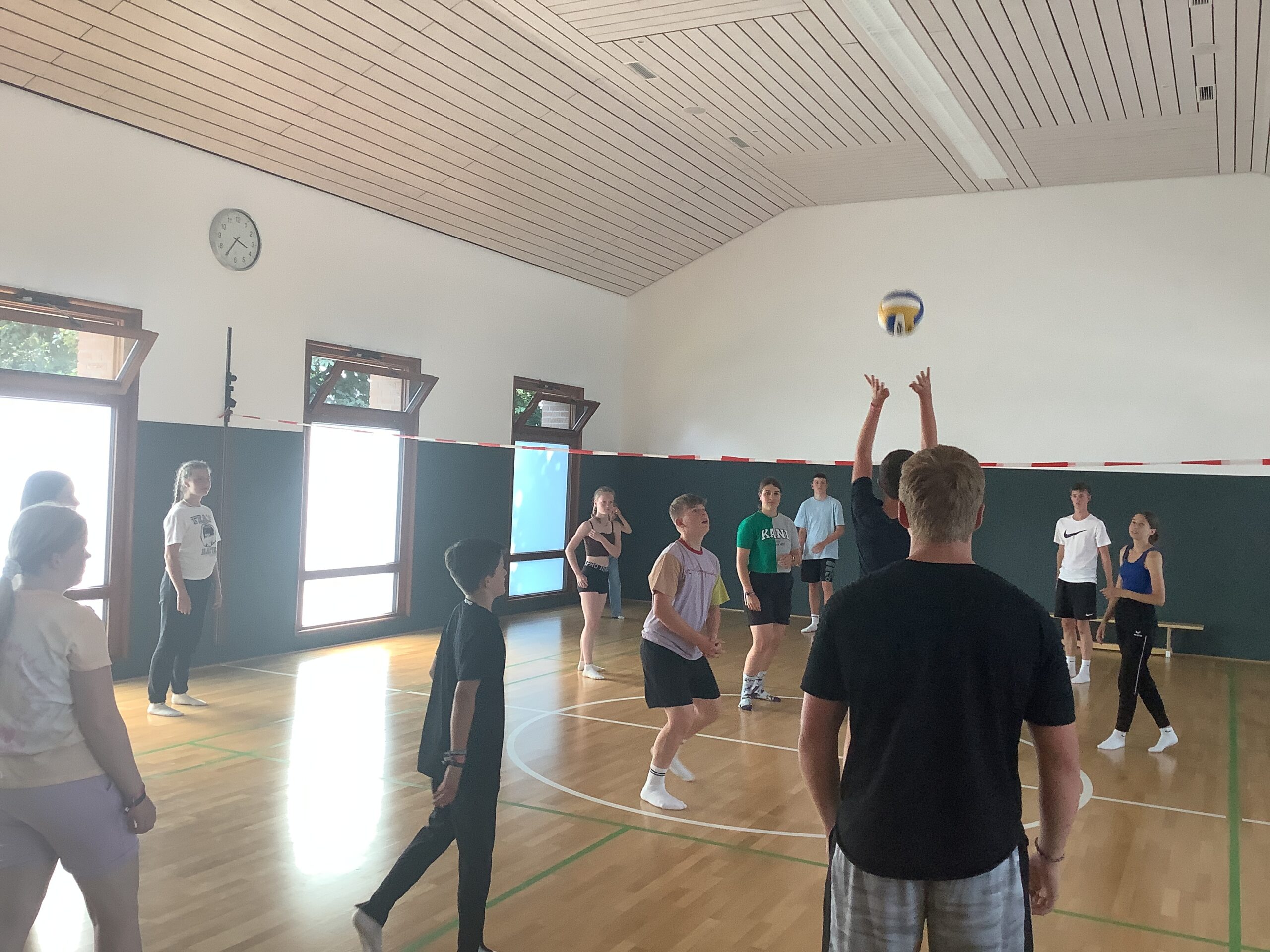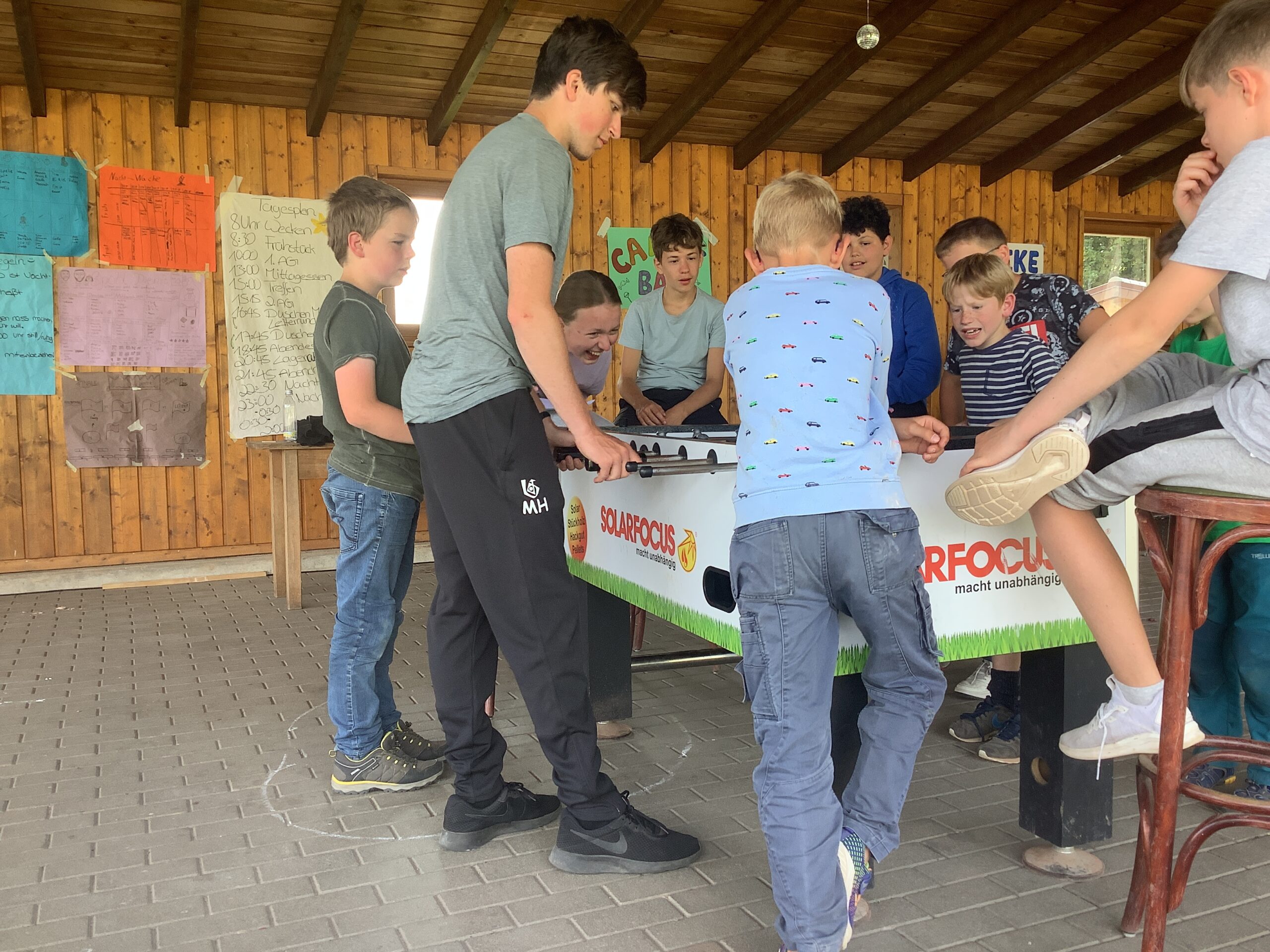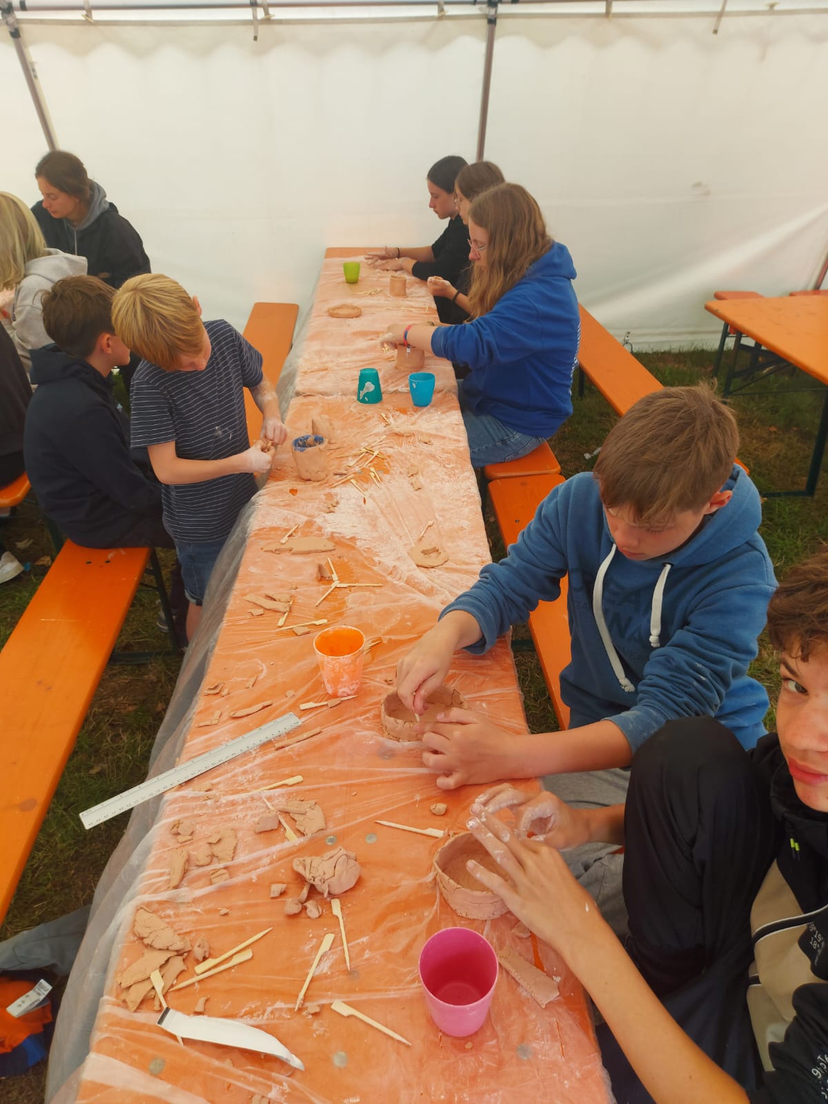 Beim FrĂŒhstĂŒck wurden wieder neue Gesichter begrĂŒĂt, die das Lager verstĂ€rken. AnschlieĂend wurden die AGÂŽs eingelĂ€utet. Zur Auswahl standen Töpfern, Tanzen und Zeltschmuck Basteln. Beim Tanzen wurde eine Choreografie einstudiert und vor dem Mittagessen vorgefĂŒhrt. Dazu gab es weitere akrobatische Einlagen der Leiter, die unter tosendem Applaus nach vorne gejubelt wurden. Geboten wurden PurzelbĂ€ume – vorwĂ€rts und rĂŒckwĂ€rts, einen Backflip und ein Rad. Den krönenden Höhepunkt bot Fiona mit ihrem atemberaubenden Flick Flack. Nach dem leckeren Mittagessen wurden die gestrig fertigstellen Lagerbauten feierlich eingeweiht. Dabei wurden keine Ăxte verschont. Am Nachmittag ging es dann in die zweite AG-Einheit mit KJG vs. Wild, Windlichter Gestalten, einem Kickerturnier und Volleyball.